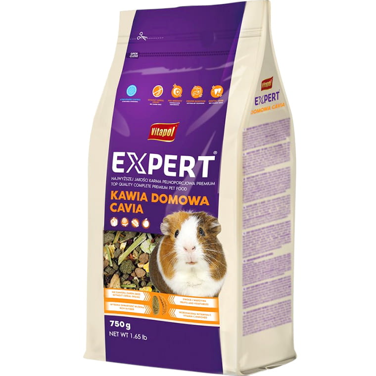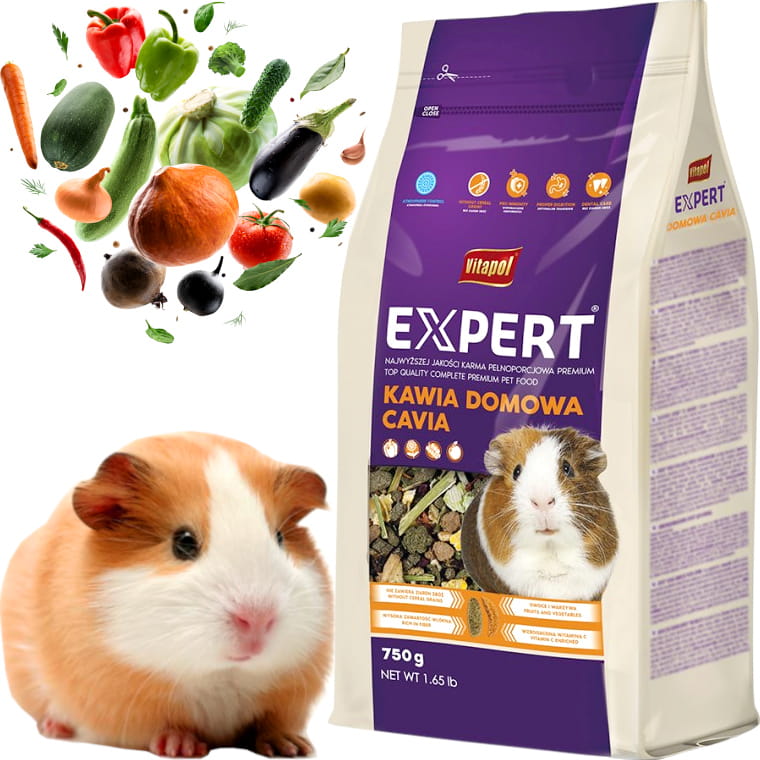 - mieszanka najlepszej jakości zbóż, nasion, owoców, warzyw oraz witaminizowanych granulatów dla świnki morskiej, kawii domowej