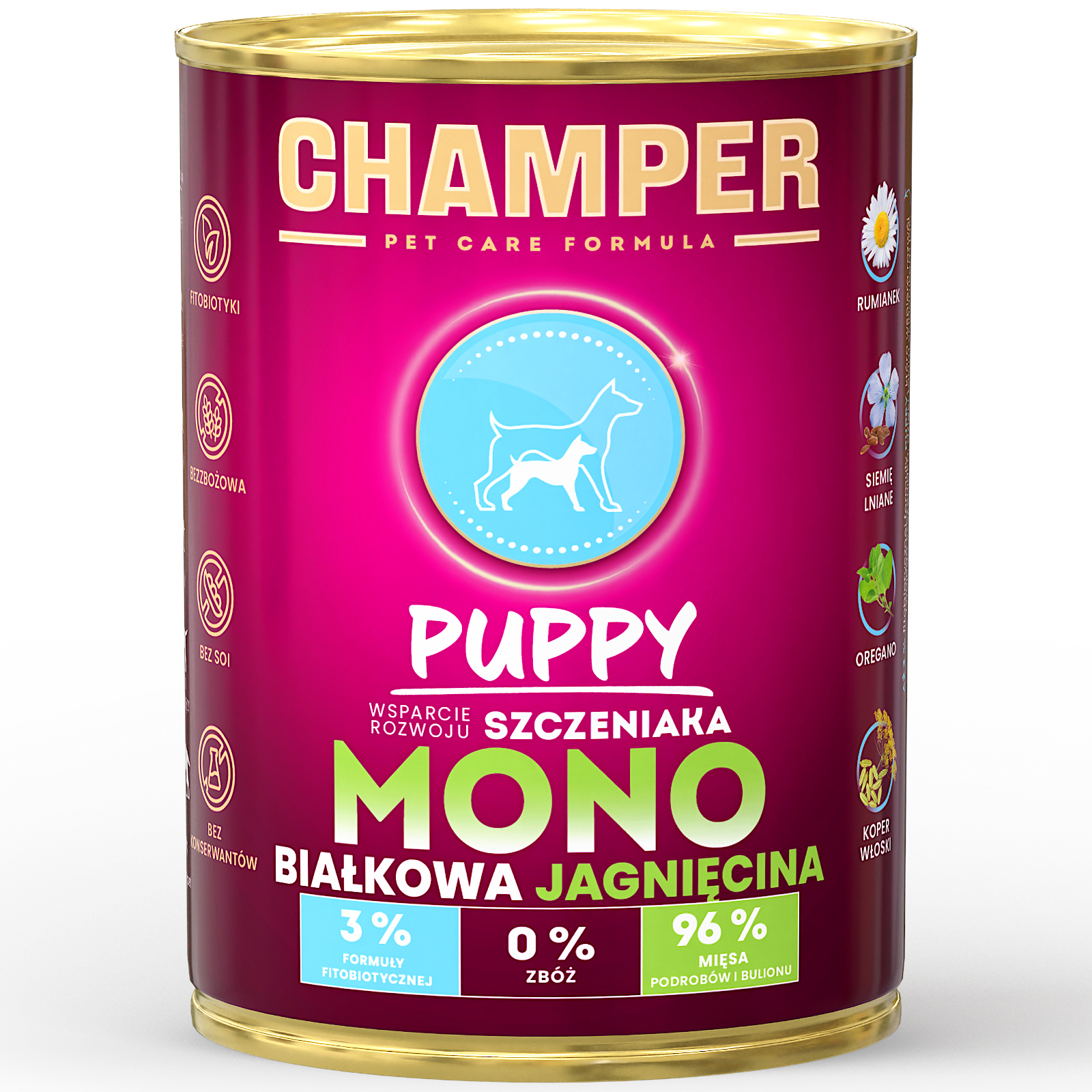 - karma mokra monobiałkowa (pełnoporcjowa) dla szczeniąt wszystkich ras z dodatkiem fitobiotyków