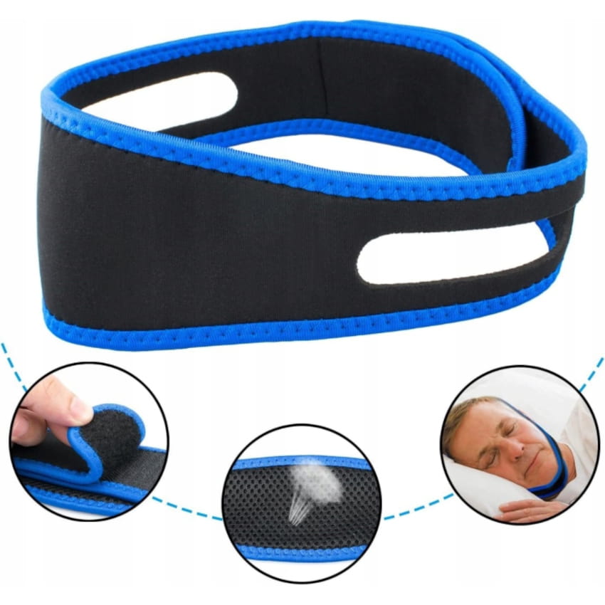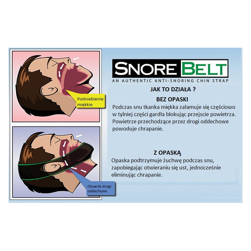 - opaska podtrzymuje żuchwę podczas snu, zapobiegając otwieraniu się ust, jednocześnie eliminując chrapanie