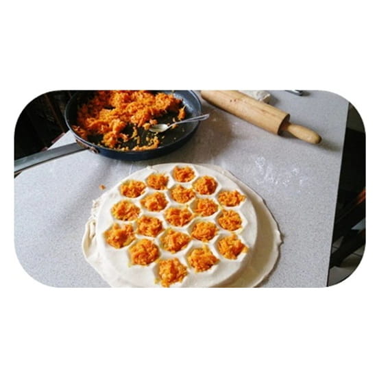 - rozwałkowany kawałek ciasta położyć na wcześniej posypaną mąką pierożnicę