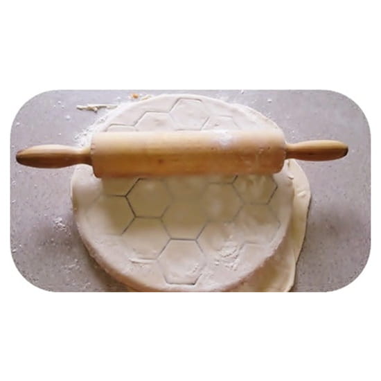 - po nałożeniu farszu nałożyć drugi rozwałkowany kawałek ciasta, posypać mąką i lekko wałkować do pojawienia się poprzecinanych oczek (patrz zdjęcie)