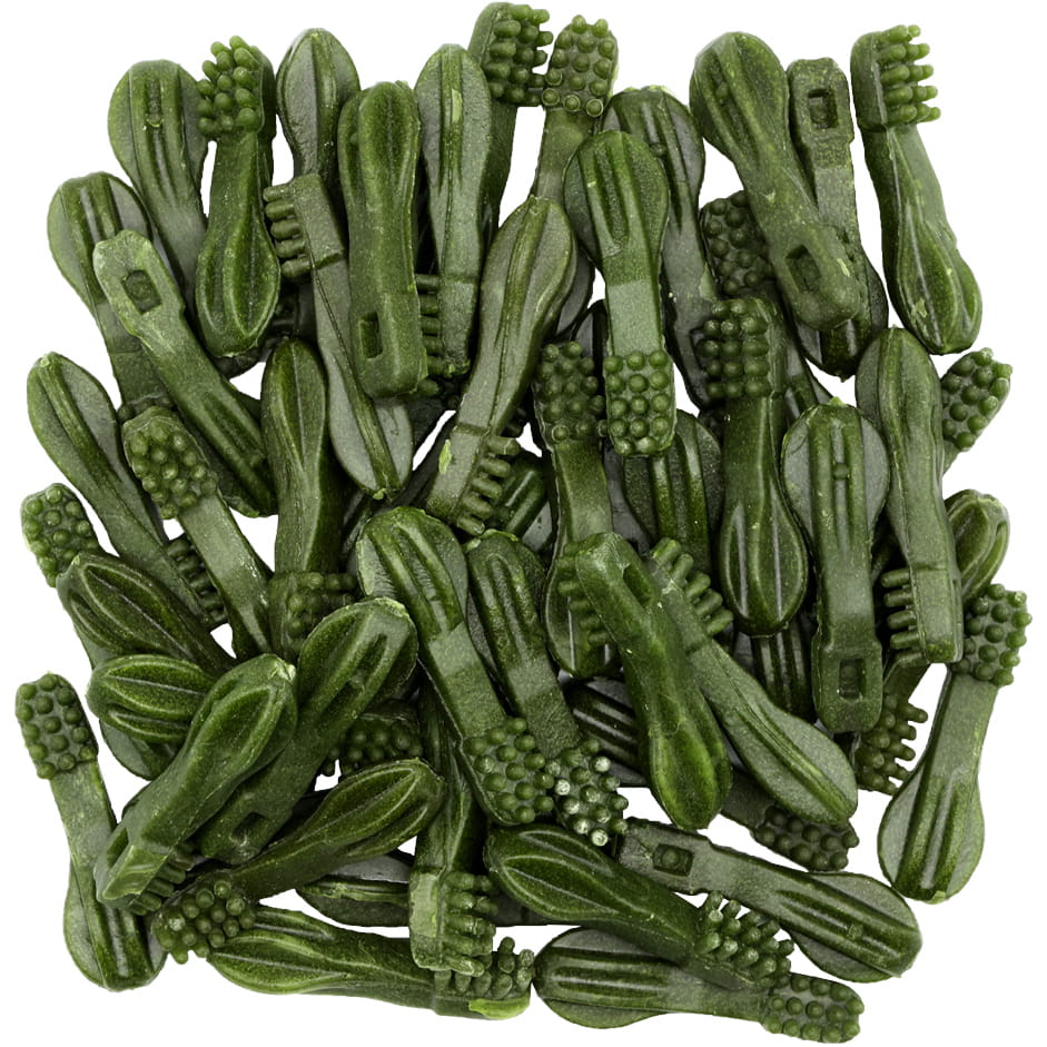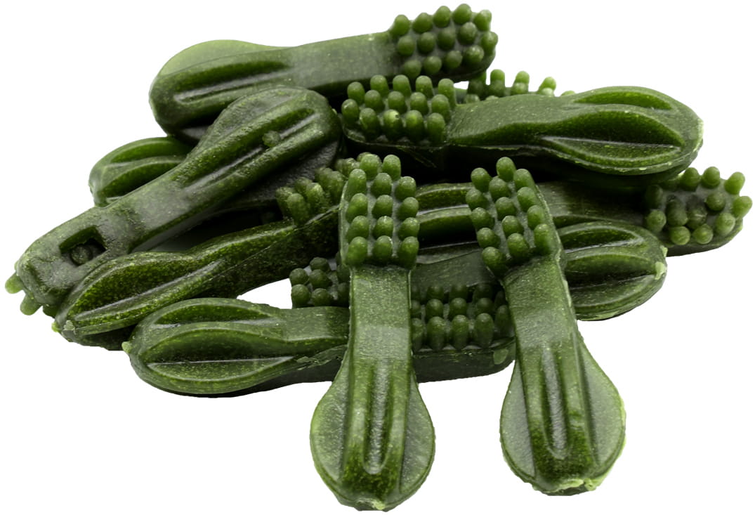 - Roślinno-mięsne szczoteczki dentystyczne z miętą i spiruliną – wspierają higienę jamy ustnej, odświeżają oddech i zaspokajają potrzebę żucia.