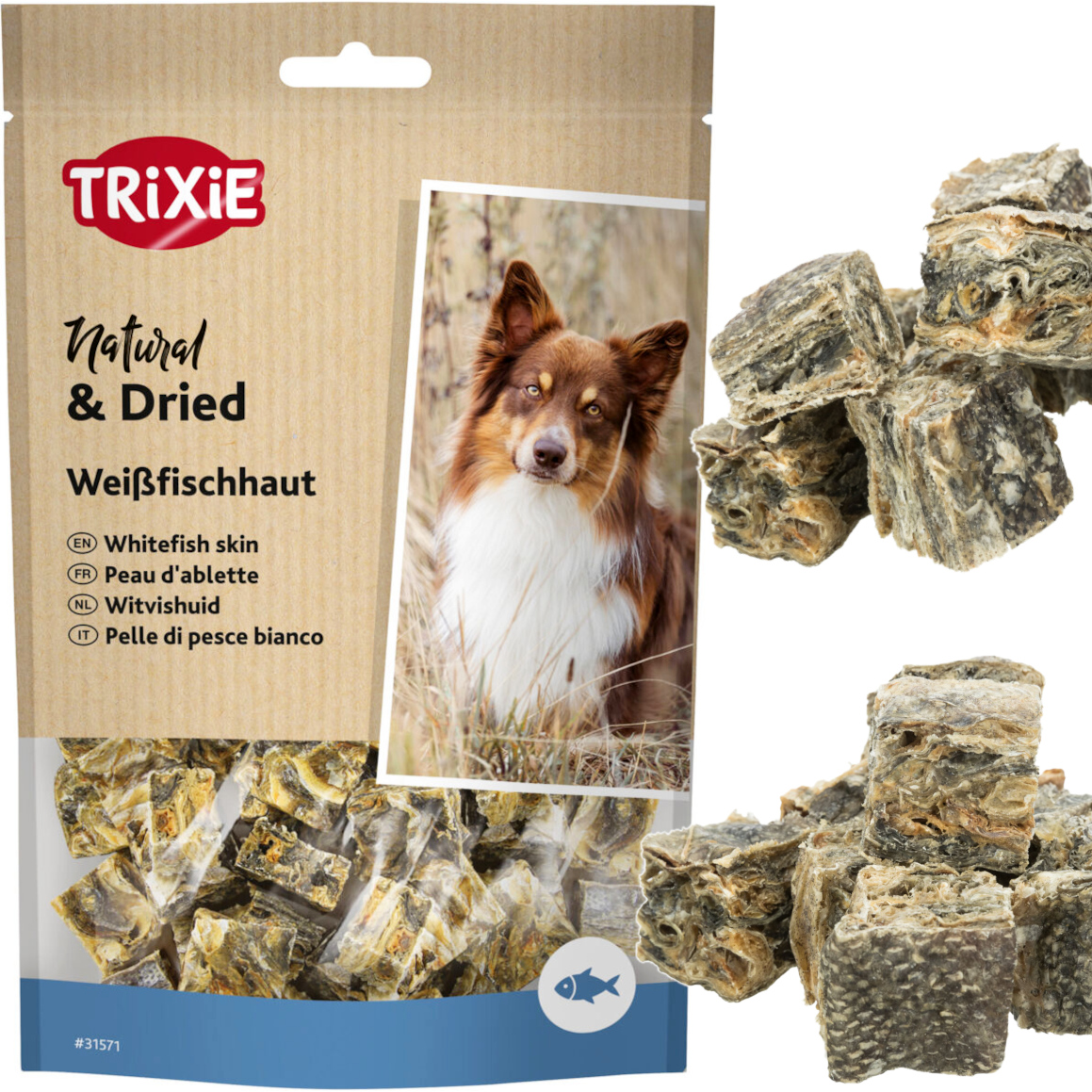 - suszona skóra z białej ryby: 100% w tym: